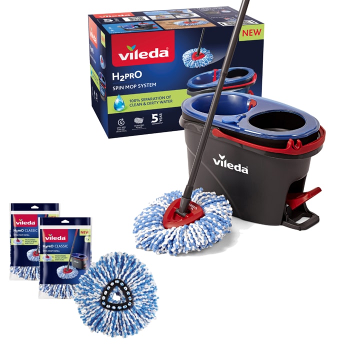 Previously known as the Vileda RinseClean Spin Mop and Bucket System... The Vileda H2PrO Spin Mop & Bucket System features an innovative dual-chamber bucket, ensuring clean and dirty water stays separate for a more hygienic clean. Its hands-free wringing mechanism, activated by the foot pedal, allows you to control the moisture level of the mop easily.