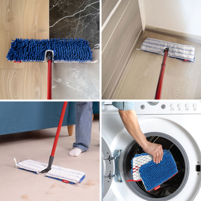 - Flip Mop: Dual sided the blue side removes and collects the finest of dust and particles, whilst you can use the white side to absorb spills or mop and shine the floor.