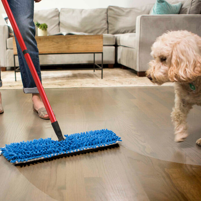 The mop head can be flipped so you can remove pet hair from your floors with the blue side. You can then flip it over to the white side which is perfect for cleaning your pets' spills and for cleaning and shining your floors.