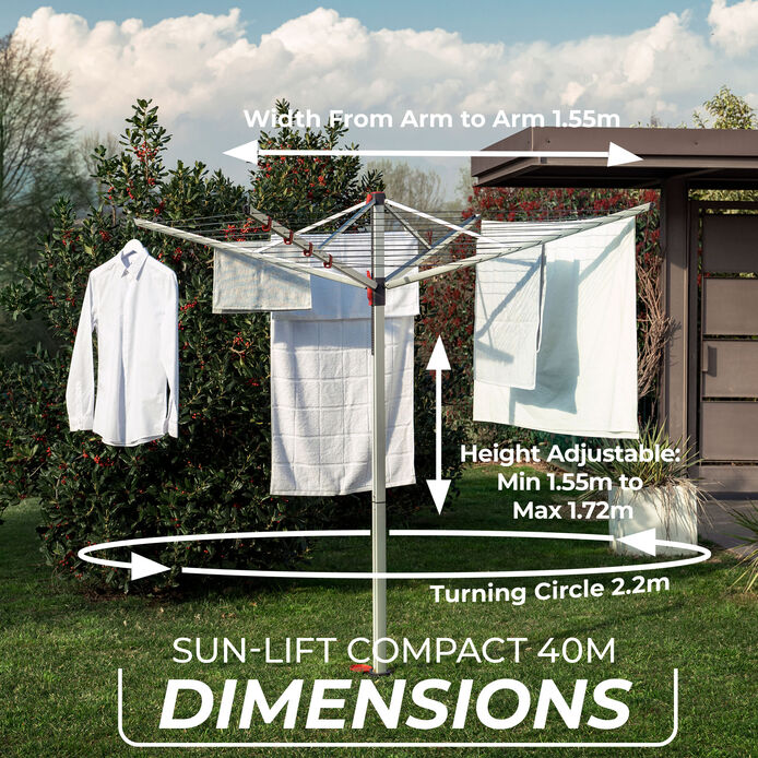 The Sun-Lift Compact 40m rotary dryer airer is easy to use and assemble. It can be quickly put together and set up with the ground socket provided. Washing lines can be easily tensioned using the lever to help reduce unnecessary creasing on your laundry and prevent laundry from touching the ground. Thanks to the easy-lift system, it conveniently opens and closes without effort and the height can be adjusted from 1.55m to 1.72m to suit your needs.