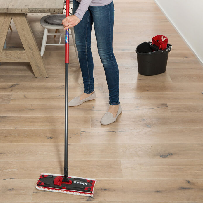 The Vileda Ultramax complete mop & bucket set includes a mop and wringer, a telescopic rod and a bucket. All essential floor cleaning tools united in one single set.