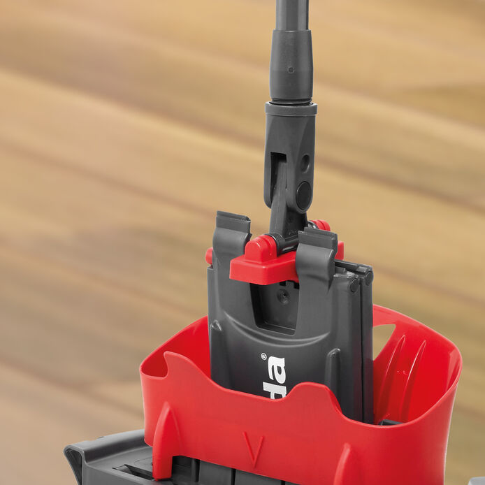 To prevent getting splashed with dirty water, the bucket wringer has an integrated water-splash protection so that the quick rotation of the mop head does not cause a mess.