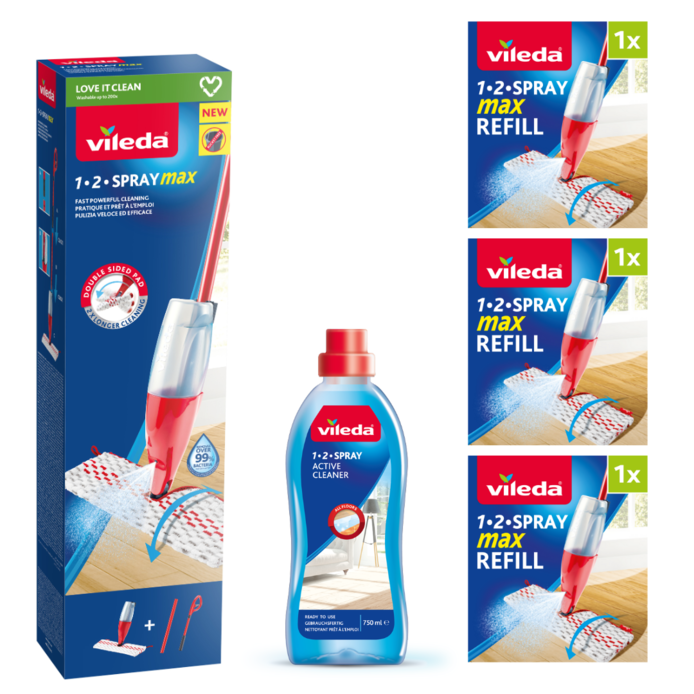Vileda 1-2 Spray Max mop is our double-sided spray mop - flip the mop pad 180 degrees and clean twice the floor surface area.With advanced microfibre technology, the mop pad removes grease, dirt, stubborn stains and over 99% of bacteria with just water*. The mop pad is machine washable at 60 °C and can be reused time and time again.
