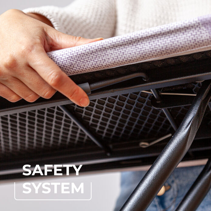 The Diamond S Ironing Board has an adjustable height of up to 90 cm and is equipped with a child safety system, which prevents the board from collapsing if accidentally knocked.