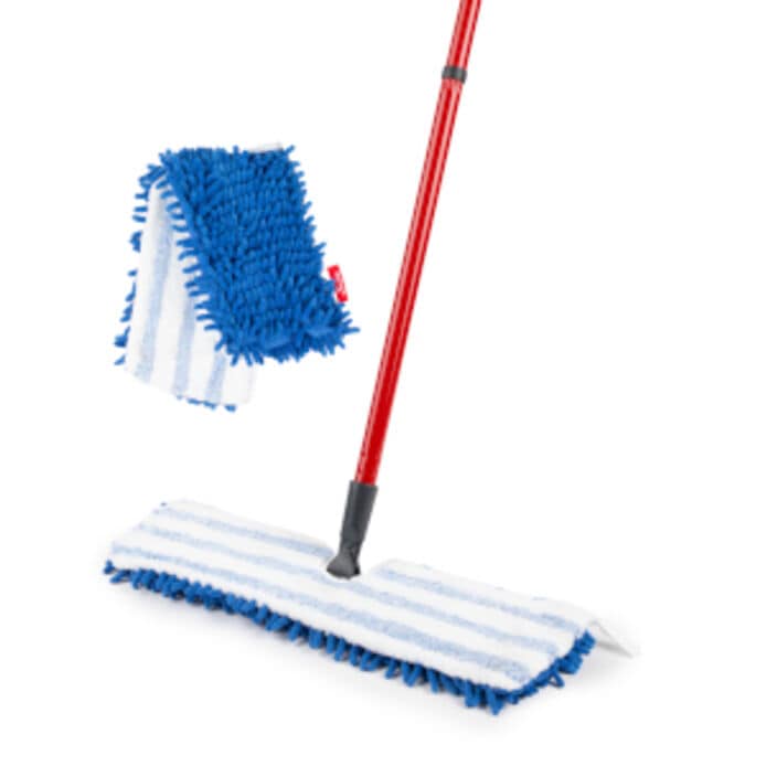 - Flip Mop: Dual sided the blue side removes and collects the finest of dust and particles, whilst you can use the white side to absorb spills or mop and shine the floor.