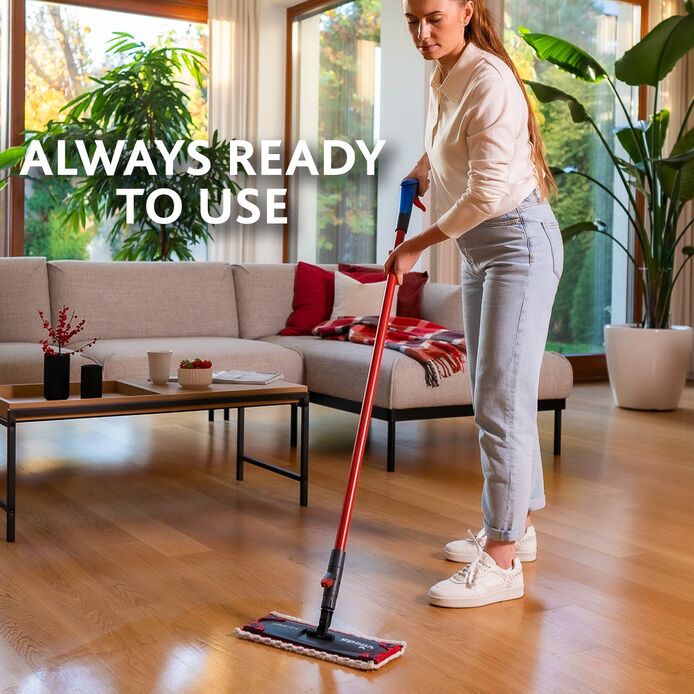 The Vileda 1-2-Spray Mop is a mop without the need for a bucket. Just add water or the 1-2 Spray Active Cleaner Liquid into the integrated handle and then squeeze the trigger to spray and mop! The reusable microfibre mop pad means there’s no need for disposable floor wipes, helping you to save time and reduce your waste.