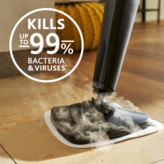 No need for chemical cleaning supplies as the sanitising steam heat and the microfibre pads of this steam mop kill 99.9% of bacteria* from all floors. Easy to fit, twin refill pack fit both the Vileda Steam Mop and 100°C Spray Mop (sold seperately).