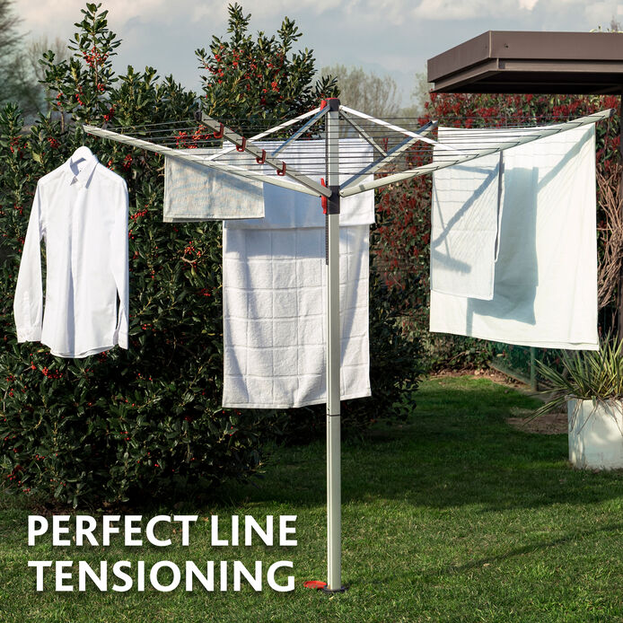 The Vileda Sun-Lift Compact Rotary Dryer has an innovative and patented tensioning line system which allows you to keep lines perfectly tight. This clothesline has 40m of line length and is the perfect solution for family wash loads and even large items such as bed sheets.