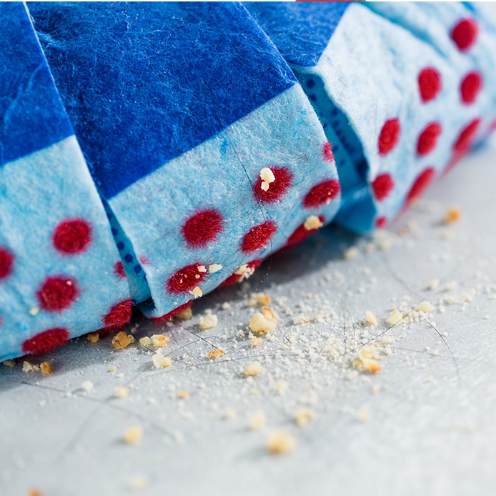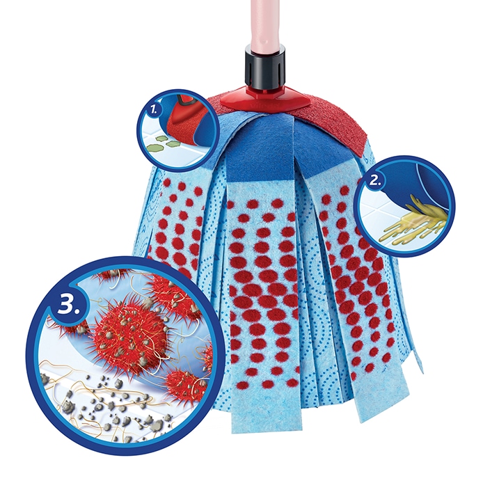 The red non-scratch scourer removes stubborn dirt, the blue microfibre zone removes greasy residue and the 3D red power dots for picks up extra hair and dirt particle.