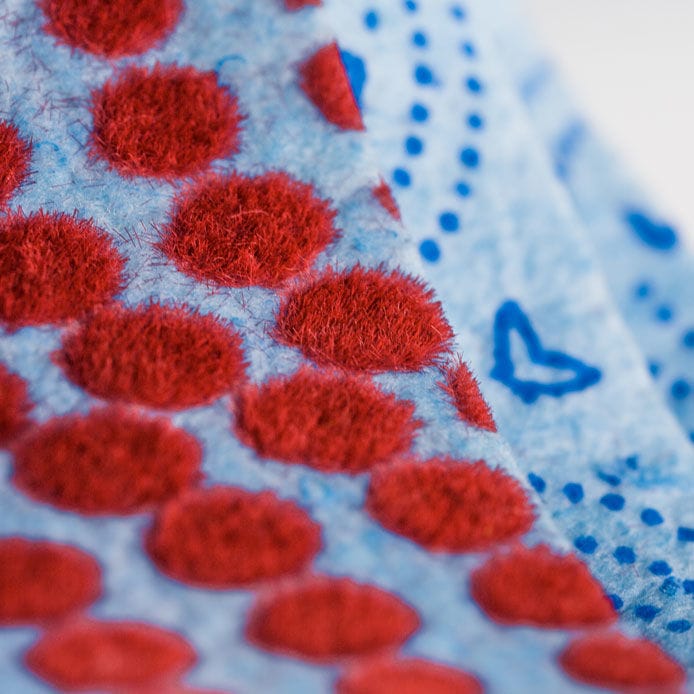 The red non-scratch scourer removes stubborn dirt, the blue microfibre zone removes greasy residue and the 3D red power dots for picks up extra hair and dirt particle.