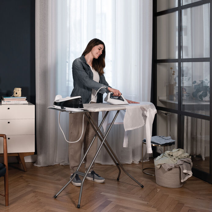Vileda Total Reflect Ironing Board ensures faster ironing due to the metallised foil layer. The foil material is laminated underneath the soft cotton cover, which reflects heat and steam back into the laundry, helping to remove creases quicker.