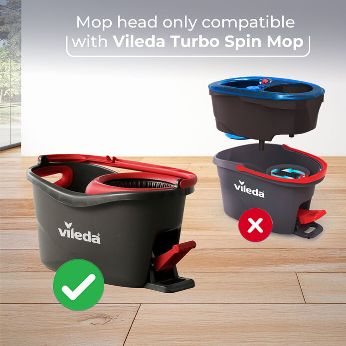 The mop refill is compatible with all Vileda Turbo spin mop systems. Simply pull on the mop strands to unclip the head and replace it by pressing it into the red frame.