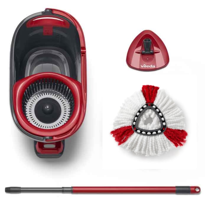 The Vileda Turbo spin mop and bucket with foot pedal is the ideal cleaning system for all floors! Its rotating wringer makes cleaning easy and quick. The complete set includes a mop and bucket with a foot activated spinning wringer. It is great for mopping all hard floor surfaces including tiles, wood and laminate. No need to manually wring your mop after rinsing – the 360° spin system does the hard work for you!